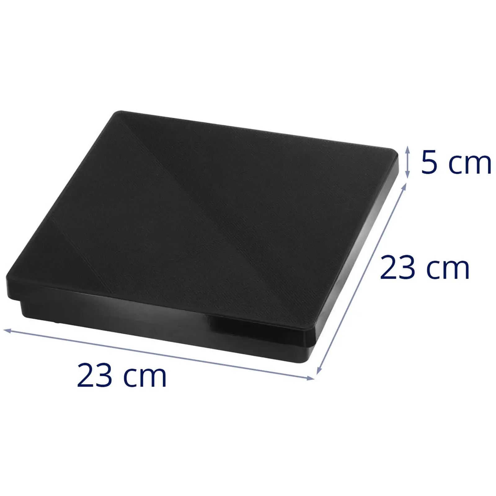 Vejepladen er 229 x 229 mm og er lavet af gummi med en rutsjesikker overflade. Denne funktion gør det muligt at veje pakker på en stabil og sikker måde, hvilket forhindrer, at pakker glider rundt under vejning. Dette er en praktisk funktion, når du arbejder med pakker af forskellig størrelse og form, da den sikrer, at pakkerne forbliver på plads, mens du vejer dem.