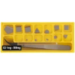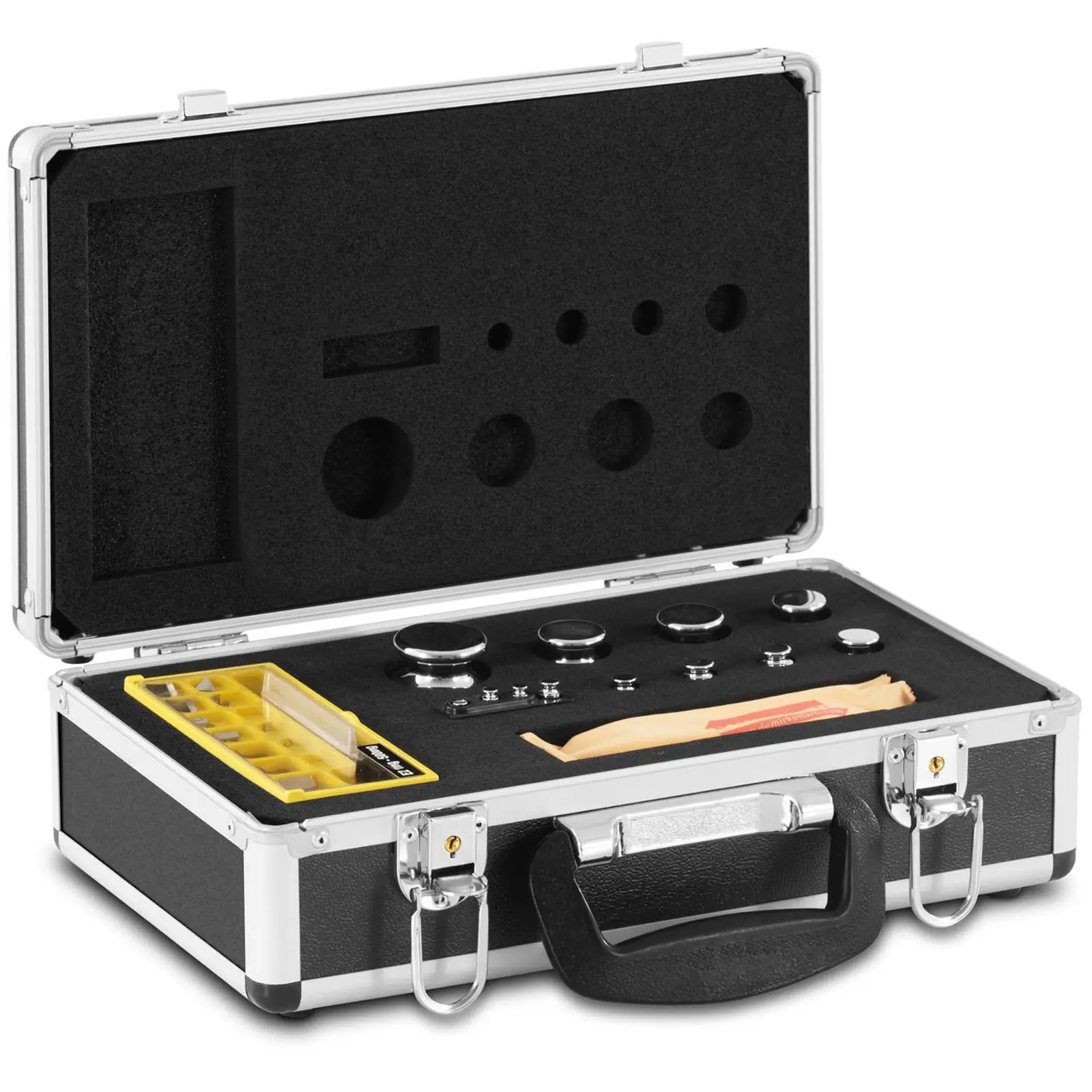 Samlet vægt, vægtlodder [g] 1*0,001; 2*0,002; 1*0,005; 1*0,01; 2*0,02; 1*0,05; 1*0,1; 2*0,2; 1*0,5; 1*1; 2*2; 1*5; 1*10; 2*20; 1*50;1*100; 2*200; 1*500